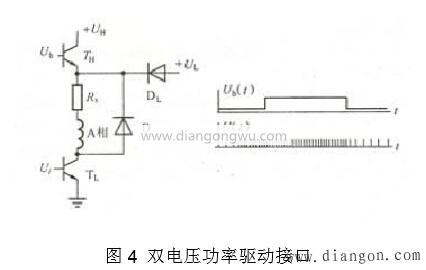 雙電壓驅動器的電源接口如圖4所示。雙電壓驅動的基本概念是在低(低頻段)以低壓UL進行驅動,而在高速(高頻段)以較高電壓UH進行驅動。這種電源接口需要兩個控制信號。 Uh是高壓有效控制信號,U是脈沖寬度調制驅動控制信號。在圖中,功率管TH和二極管DL構成功率轉換電路。當Uh為低時,TH截止,DL為正偏置,低壓UL為繞組供電。相反,當Uh處于高電平時,TH導通,DL反向偏置,并且高壓UH為繞組供電。這種電路可以使電動機在高頻范圍內具有更大的輸出,并在停止靜態鎖定時降低了功耗。