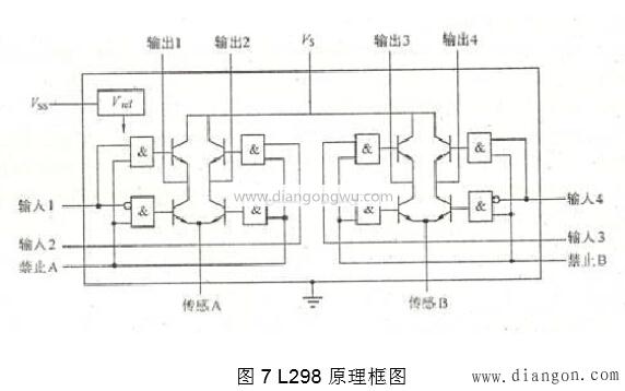 L298芯片被設計為接受標準的TTL邏輯電平信號,并且是一種H橋驅動器,可用于驅動感性負載。 H橋可以承受46V的電壓和高達2.5A的相電流。 L298的邏輯電路(或XQ298,SGS298)使用5V電源,功率放大器級使用5至46V電壓。下部的橋式發射極都單獨繪制以訪問電流采樣電阻。 L298等采用工業級15引腳雙列直插小瓦封裝。內部結構如圖7所示。 H橋驅動器的主要特征是它可以在正向和負向兩個方向上向電動機繞組供電。 L298特別適合于驅動兩相或四相步進電動機。 {{Paging}}