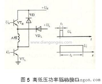 高壓和低壓電源驅動器接口如圖5所示。高壓和低壓驅動器的設計思想是使用高壓UH電源來增加導電相繞組的電流前沿,而與電動機的工作頻率無關,并且在該前沿之后,使用一個低電壓UL保持繞組電流。這種效果還改善了驅動器的高頻性能,并消除了額外的損耗,因為不需要將電阻器R串聯連接。高壓和低壓驅動器電源接口還具有兩個輸入控制信號Uh和Ul,必須保持同步(如圖5所示),并且前沿同時跳躍。在圖中,高壓管VTH的導通時間t1不能太大或太小。如果太大,電動機電流將過載,如果太小,動態性能將不會得到很大改善。通常,它可以是1到3毫秒。 (當該值等于電動機的電氣時間常數時更合適。){{Paging}}
