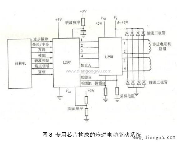 圖8是具有恒定電流斬波功能的步進電機驅動系統,使用L297(專用于環形分配器的芯片)和L298。