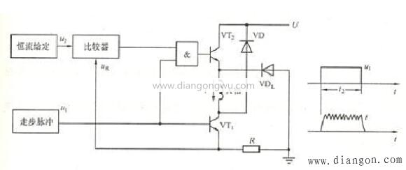 恒定電流驅動器的設計思想是將導電相繞組中的電流保持在固定值,而與鎖定,低頻或高頻操作無關。確保電動機具有恒定的轉矩輸出特性。這是一種電源接口,您可以更經常使用它并獲得更好的效果。圖6是斬波器恒流電源接口的示意圖。在圖中,R是用于電流采樣的小型電阻器,稱為采樣電阻器。如果電流不大,則由工作脈沖同時控制VT1和VT2,并且當電流超過給定的恒定電流值時,VT2將被切斷,電源U將被切斷。由于電動機繞組具有較大的電感,因此二極管VD續流以保持繞組電流,電動機通過消耗電感的磁場能量來發電。此時,電流根據指數曲線減小,并且相同的電流采樣值減小。當電流小于恒定電流值時,VT2接通,電源再次接通。重復地,電動機繞組電流穩定在由給定水平確定的值,從而形成小的鋸齒波,如圖6所示。