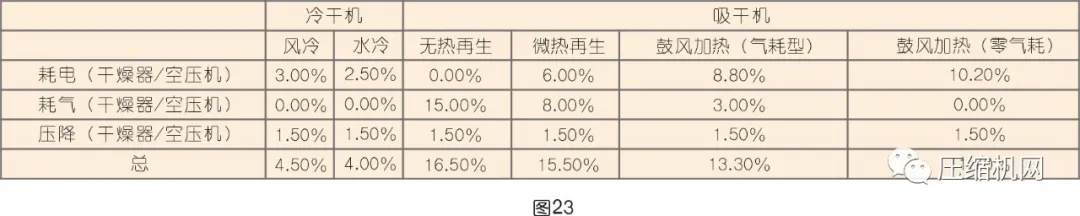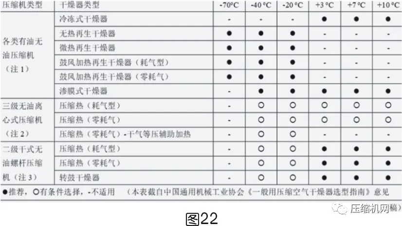 干燥機的選型原則:能用冷干機就不用吸干機,再生方式能用電就不用氣,能用熱就不用電。(見圖22)