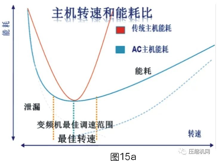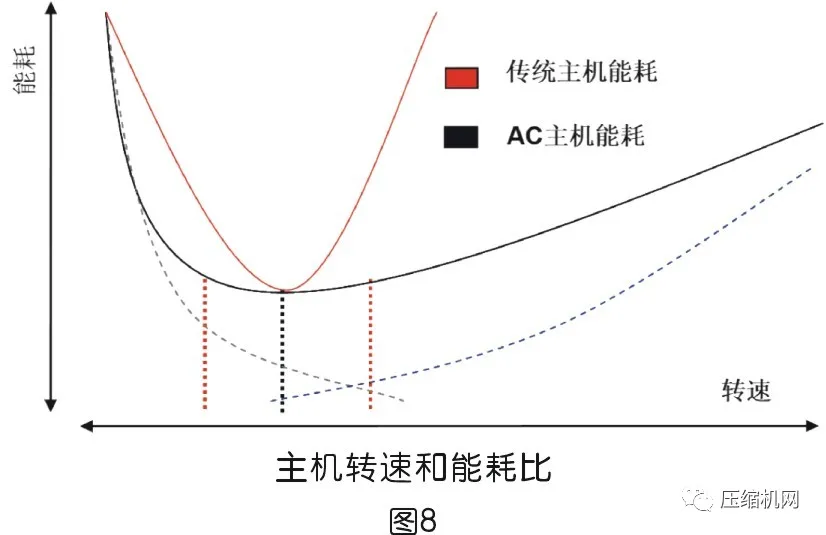 正如圖8所示,當主機在某個轉數下,其能效值可以達到一個平衡點(內泄露和機械損失在某段轉數下主機能耗處于低值,某個轉數點為最佳)。當偏離該區域值時,無論增加轉數或減少轉數,都會引起主機增加能耗。