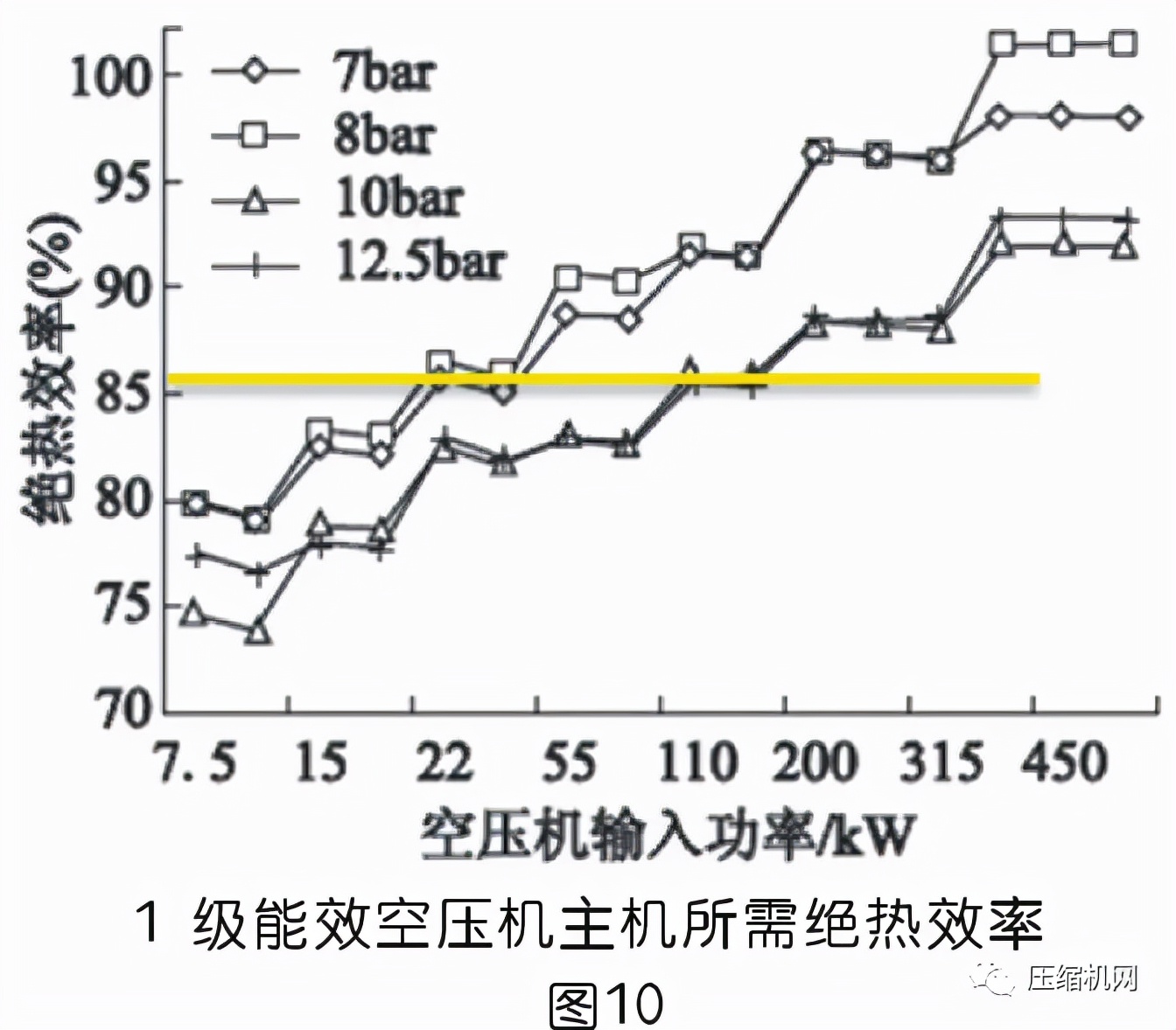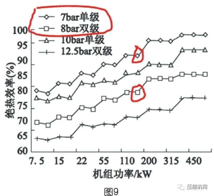 從理論上來說,兩級壓縮由于級間壓縮比小,主機泄露少(壓力低),同時第二級進氣溫度由于中間冷卻作用變低,因而在相同空壓機能效限定值,兩級比單級壓縮的所需的絕熱效率更低。見圖9為單級和雙級壓縮達到1級能效時主機所需的絕熱效率。