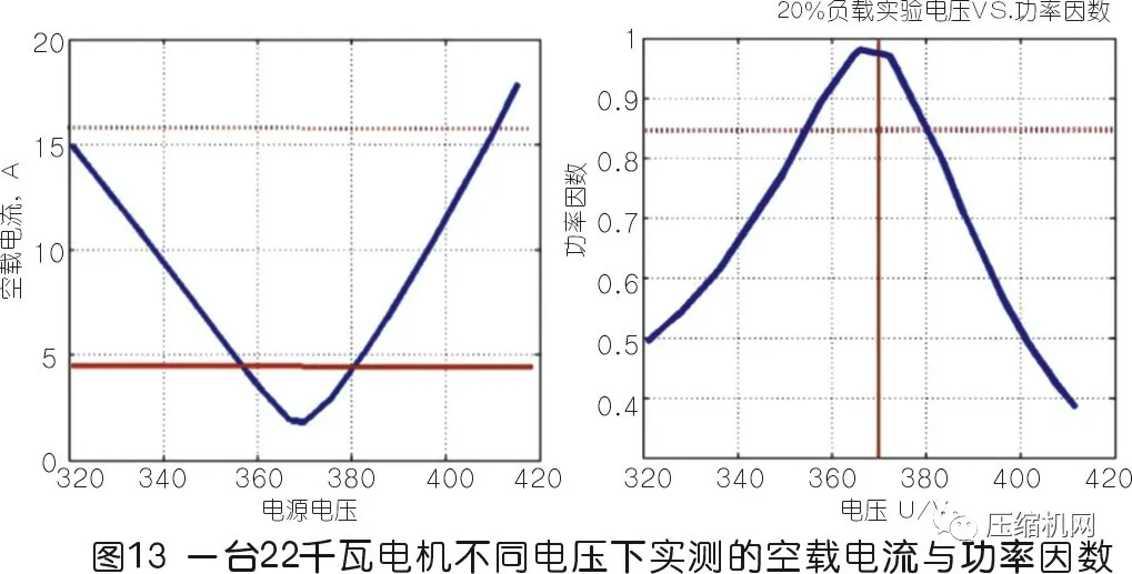 永磁電機雖然在額定電壓的時候有很好的節能效果,但是在實際用戶現場電壓經常會偏離額定電壓,而當電壓大于或者小于感應電壓時,電流都會急劇增大,功率因數變小,節能效果大幅度變差。(見圖13)。由圖中可以看出:偏差在±3%電壓范圍內時,電機功率因數大于或等于0.9,否則,功率因數較低。