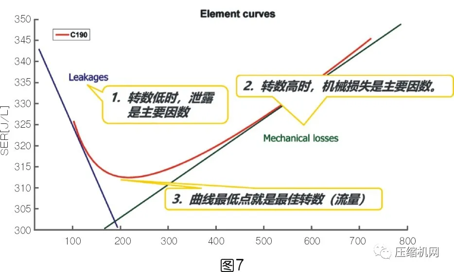 ①當轉數低時,泄露會影響到比功率值上升(左邊曲線);