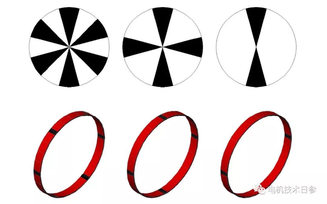 (1)安裝在被測電機軸伸端的皮帶輪端面或聯(lián)軸器側(cè)面應涂有黑白扇形面或十字槽,扇形段數(shù)與電機極數(shù)相同,如下圖所示。
